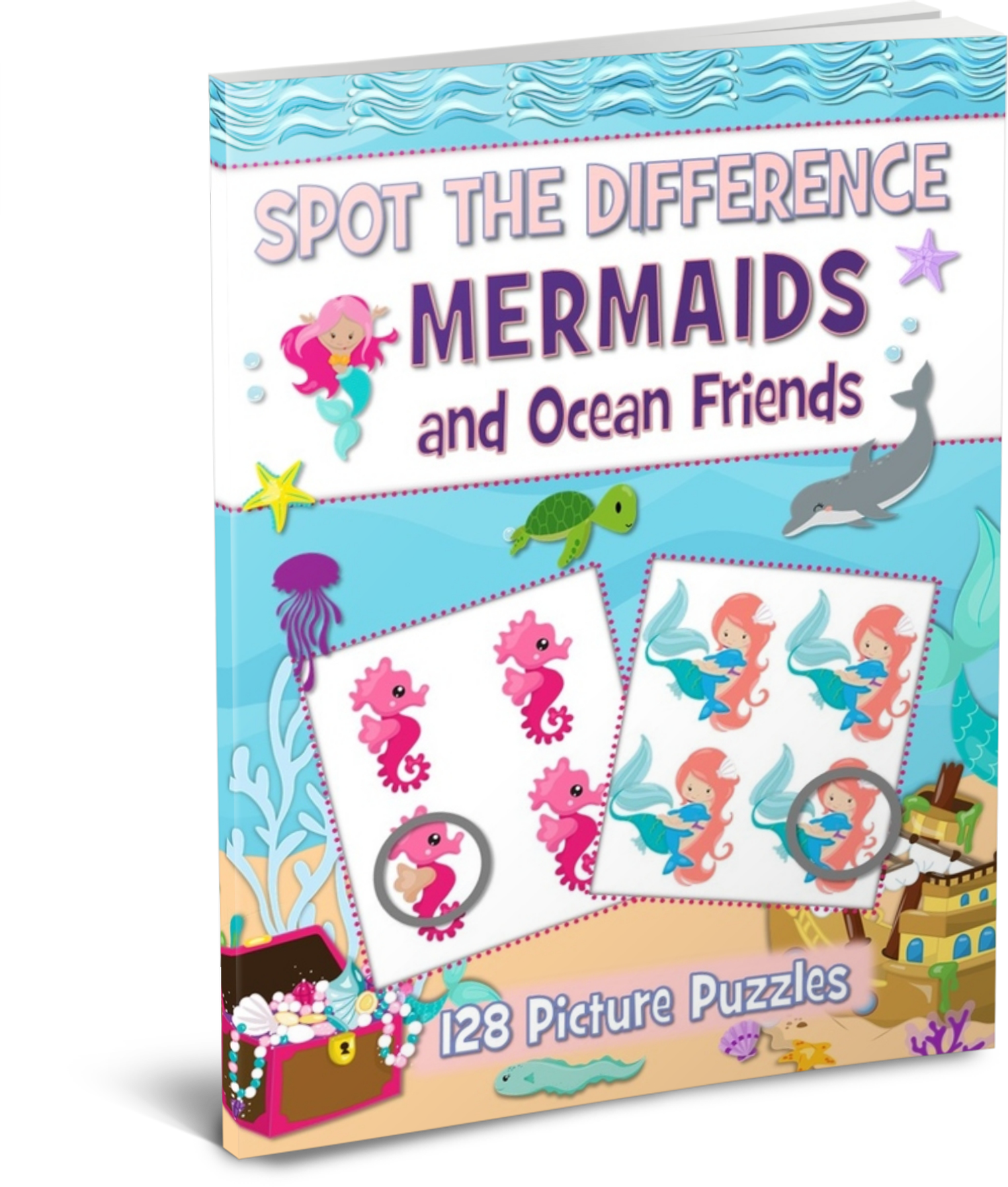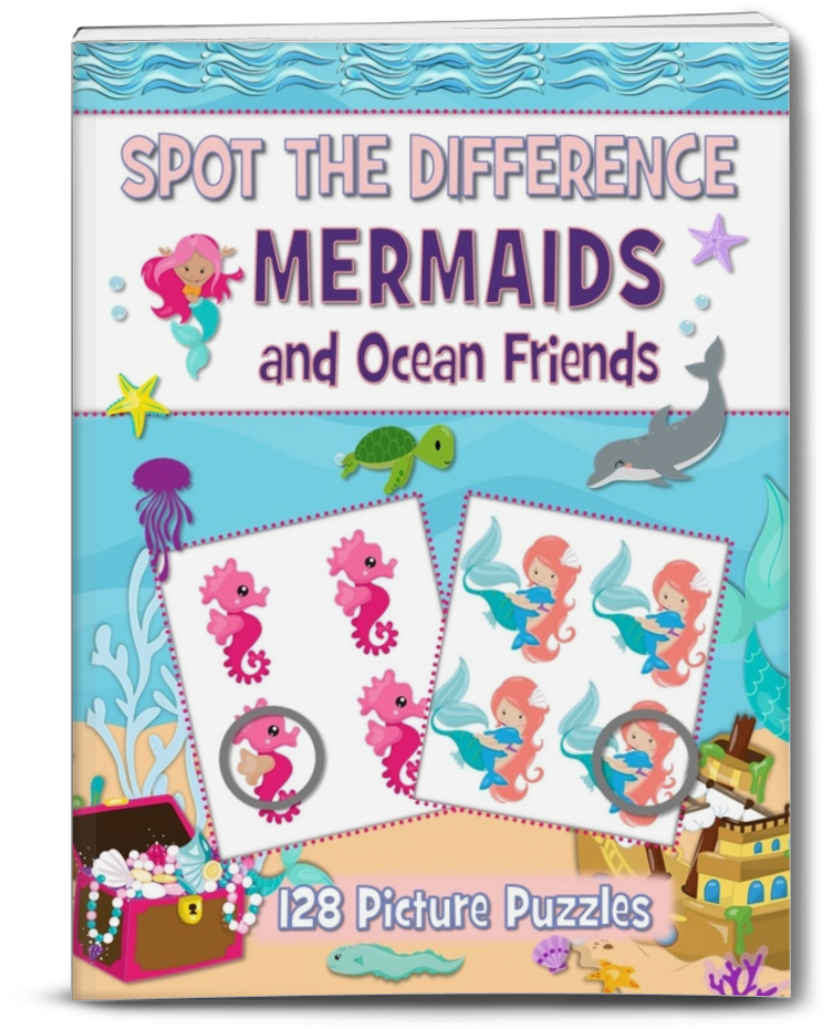 Spot the Difference Mermaids and Ocean Friends Picture Puzzles features 124 delightful puzzles filled with charming mermaids and their underwater companions. From playful dolphins to colorful fish and sea turtles, each scene is packed with ocean magic and hidden details waiting to be discovered.